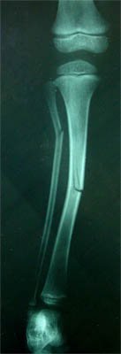 Greenstick fracture in tibia occurs while landing on foot in fall from height or due to blow to leg. But the force required for causing fracture to the tibia is higher than the force causing fracture in radius and ulna. The common sites of fracture are middle third and lower third of shaft of tibia.